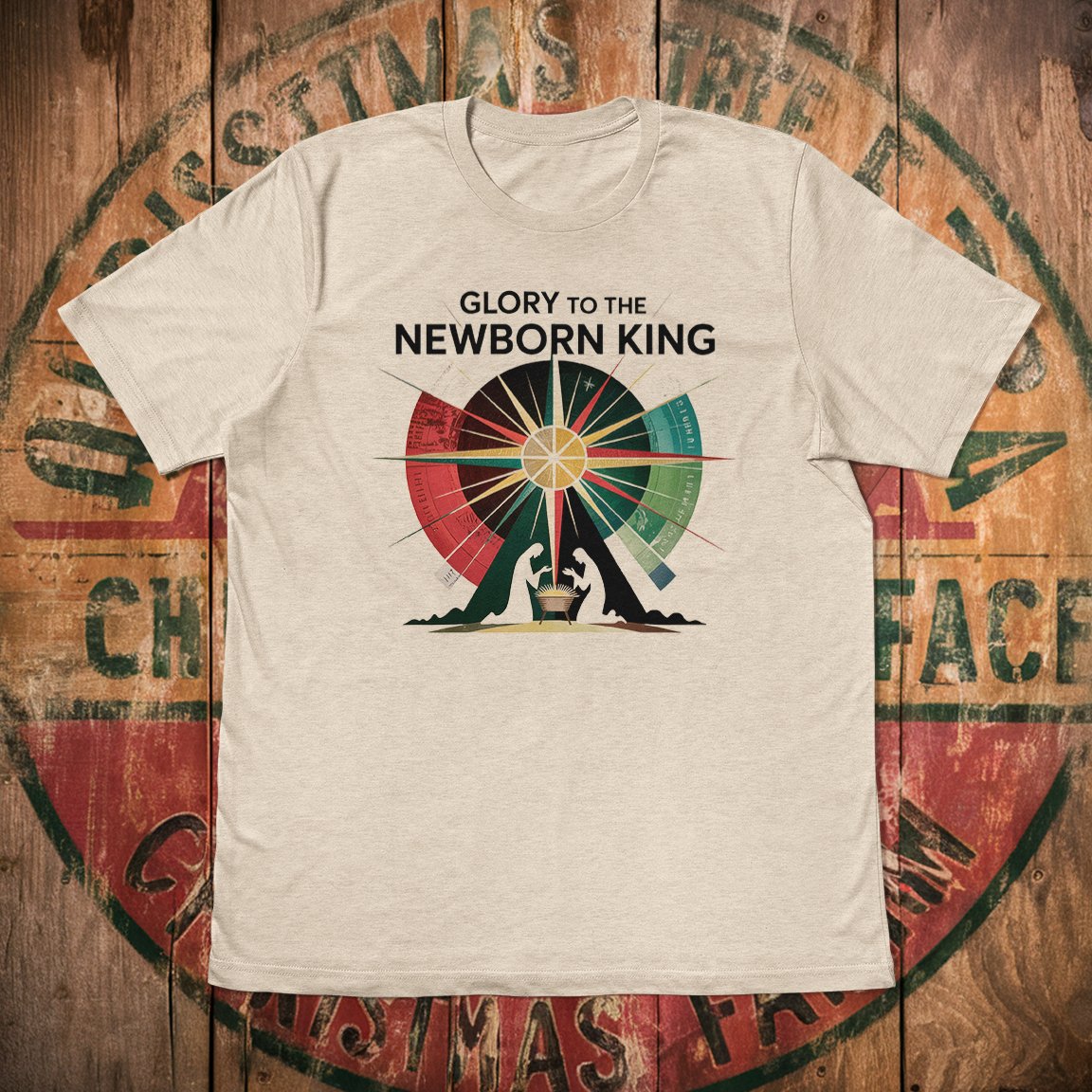 A soft, breathable jersey tee printed with a warm nativity illustration that centers on a radiant star and the phrase “Glory to the Newborn King.” Lightweight Airlume cotton keeps the tee comfortable for layering during chilly carol nights or for wearing on a bright Sunday morning. The design’s muted red and green wheel evokes vintage holiday prints while remaining subtle enough for everyday wear. This shirt sits with a retail fit and a classic crew neckline, so it looks neat under a sweater or worn solo while you sing, attend a candlelight service, or gather with family.
